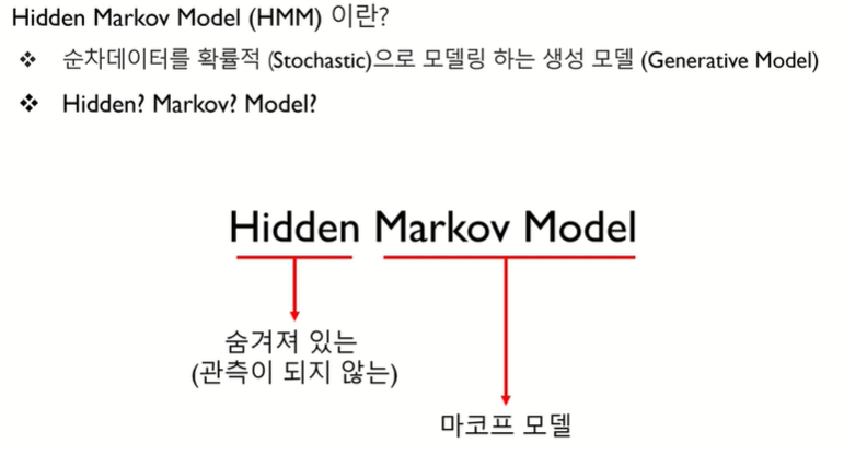 순차데이터 Sequence data 시간특성이 있는 데이터 Hidden Markov Models Markov Model state가 변화하는 횟수를 matrix에 누적하여 적고 row sum으로 나누어 확률로 표현 Hidden Markov Model 같은 시간에 발생한 두 종류의 state squence 각각의 특성과 그들의 관계를 이용해 모델링 HMM 적용 예시들 HMM 파라미터 λ = {A, B, π} : 3개의 파라미터 상태전이확률행렬, 방출확률행렬, 초기상태확률행렬 HMM로 해결할 수 있는 문제 Evaluation Evaluation은 forward 또는 backward를 사용 Learning할때는 backward사용 Decoding은 Viterbi Decoding Learning HMM 응용 예시