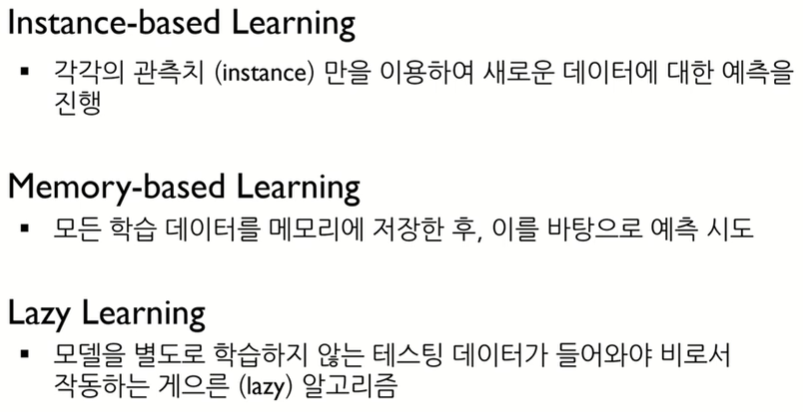 Model based learning : 데이터로부터 모델을 생성하여 분류,예측함 Instance based learning : 별도의 모델생성없이 인접데이터를 분류,예측함 KNN 특징 KNN은 모델이 아니고 알고리즘이다. KNN 분류 알고리즘 KNN 예측 알고리즘 Y 평균을 취하는 것이 가장 잘 맞음 KNN 하이퍼파라미터 k 선택 Distance measure 유클리디안 거리 Euclidean Distance 맨하탄 거리 Manhattan Distance 마할라노비스 거리 Mahalanobis distance 마할라노비스거리는 공분산을 고려하기에 B는 상관관계에 반하는 위치이기에 더 멀어짐 Correlation distance signal, profile, spectral 등 패턴 유사성을 볼 때 사용..